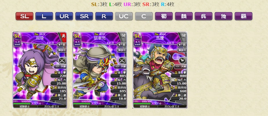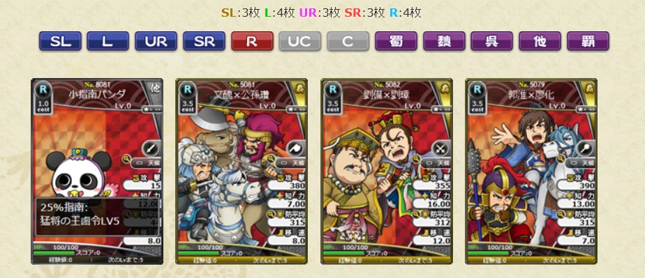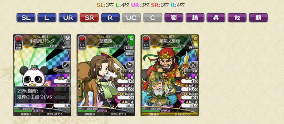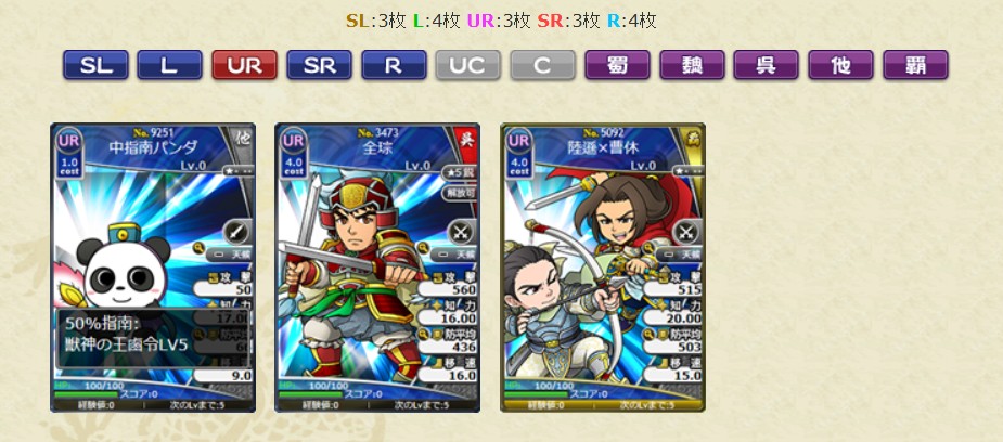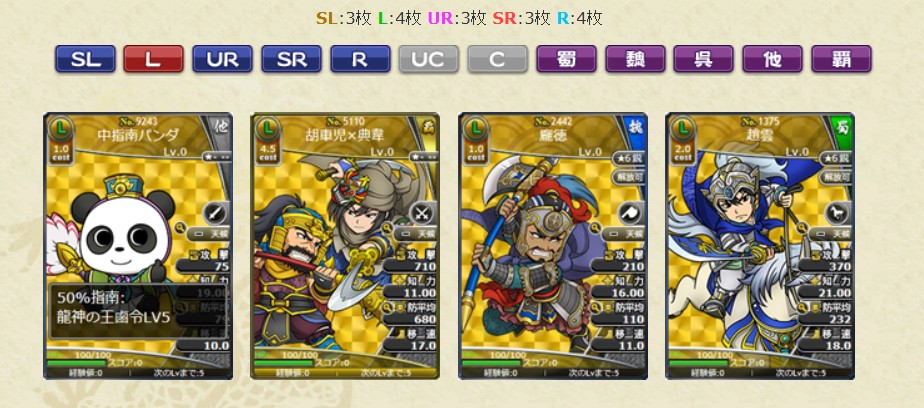 ・No.3420 SL甘寧 究竟の帝王鹵令LV2 1枚 ・No.2361 L鄧艾 剴切の天攻奪LV2 1枚 ・No.10645 SL指南パンダ 龍神の王鹵令LV5 1枚 ・No.10648 SL指南パンダ 獣神の王鹵令LV5 1枚 ・No.10649 L指南パンダ 鬼神の王鹵令LV5 1枚 ・No.10652 L指南パンダ 戦神の王鹵令LV5 1枚 ・No.4595 SL水鏡 水鏡達識LV1 3枚 ・No.4232 L水鏡 水鏡透察LV1 3枚 ブラウザ三国志より引用