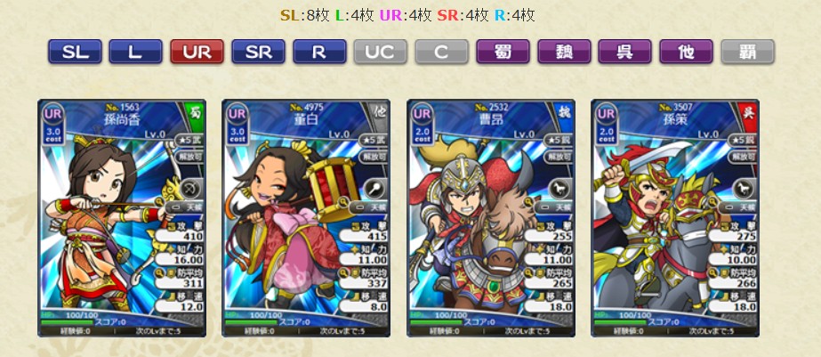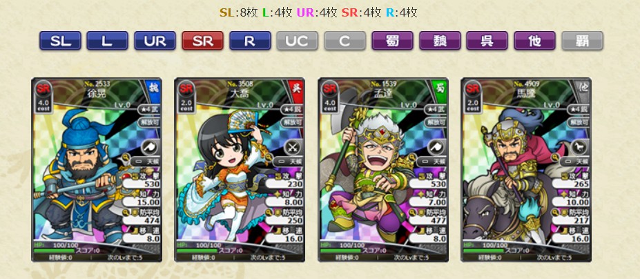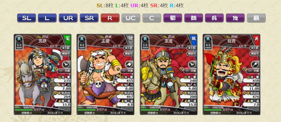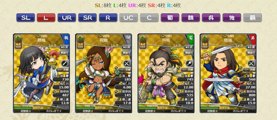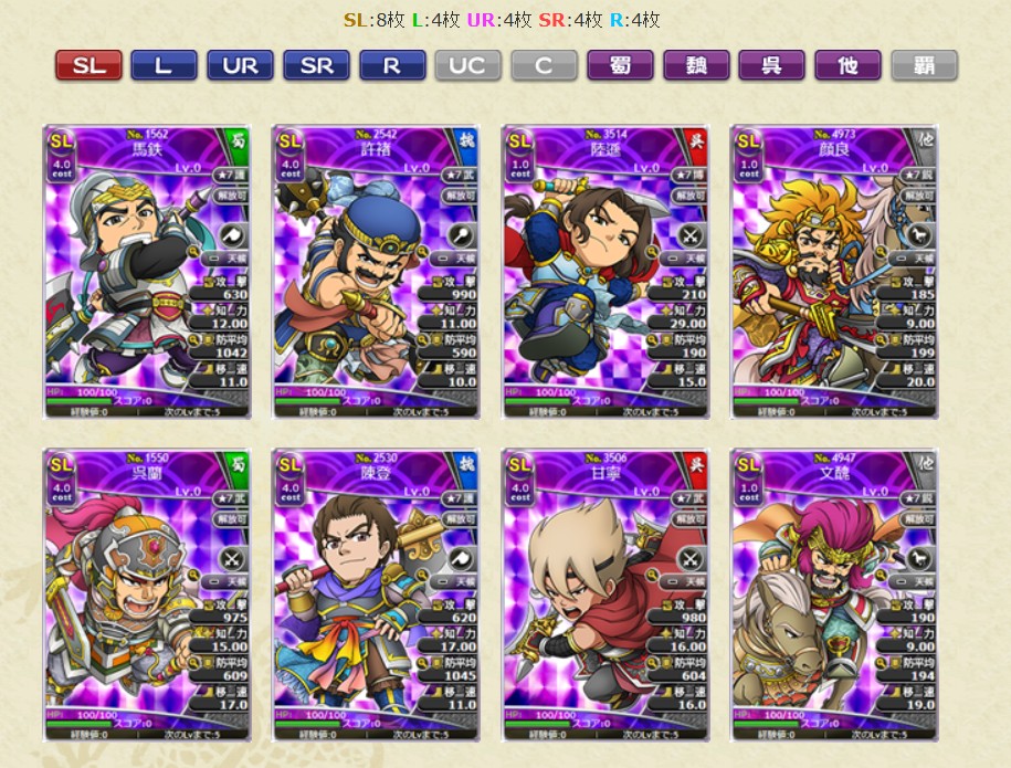・No.4906 SL呂布 群将の帝錬鏡LV10 1枚 ・No.3459 SL孫堅 呉将の帝錬鏡LV10 1枚 ・No.2484 SL張遼 魏将の帝錬鏡LV10 1枚 ・No.2497 SL朱霊 魏将の帝錬鏡LV10 1枚 ・No.2485 SL徐晃 魏将の帝錬鏡LV10 1枚 ・No.3458 SL黄蓋 呉将の帝錬鏡LV10 1枚 ・No.4595 SL水鏡 水鏡達識LV1 10枚 ブラウザ三国志より引用