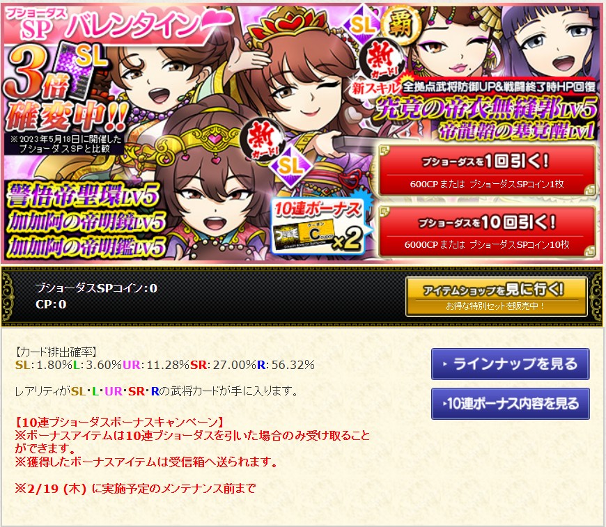 ブショーダスSP【バレンタイン】が開催中です。レアリティSLの新カードは