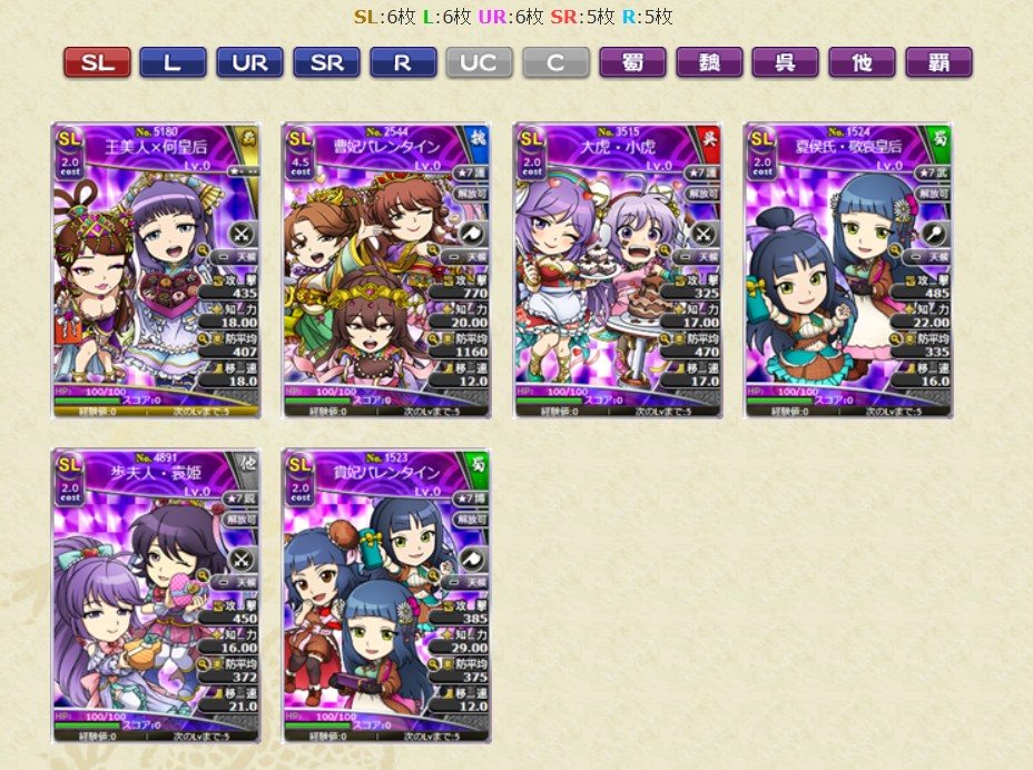クーポンブショーダス【バレンタイン】が開催中です。レアリティSLからSRまでの「水鏡」と「南華老仙」(自分用含む)が
