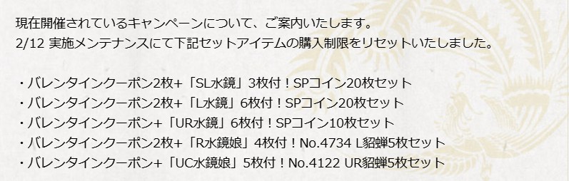 ※上記5つのアイテムは本メンテナンスにて購入制限をリセットいたしました。<開催期間:2/5 メンテナンス終了後 – 2/26 実施予定のメンテナンス開始前>