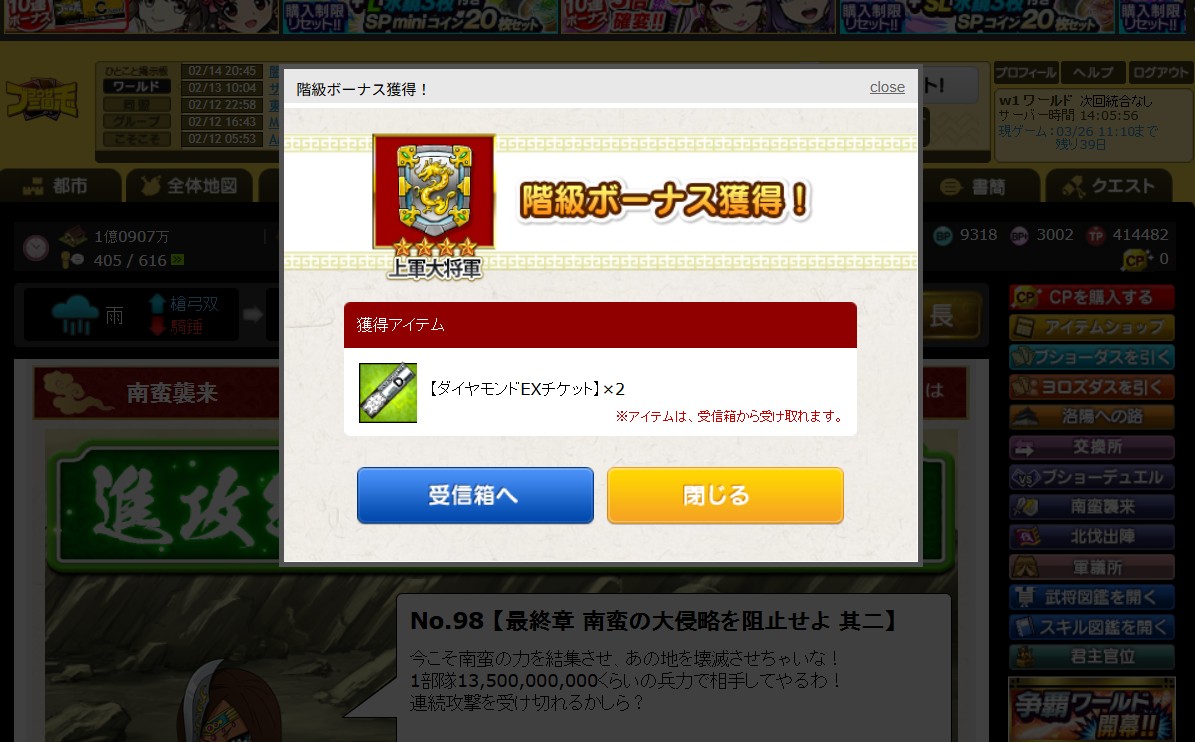 階級報酬としてダイヤモンドチケ2枚ゲットでございます。