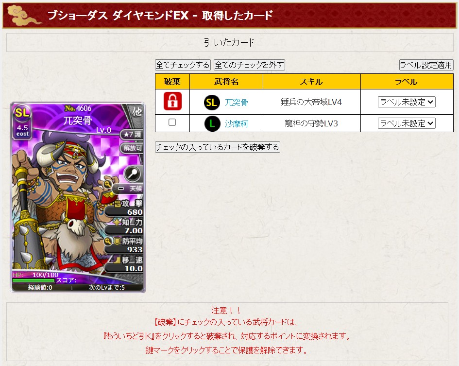 付与スキルの確率調整のため、経験値貯蔵庫でカードレベル1になるように経験値5付与。