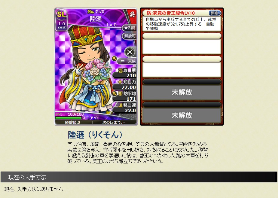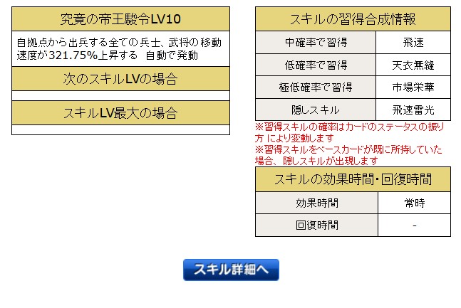 仮に空いているスキル枠2つに明鏡系スキルを付与して究竟の帝王駿令を含むすべてのスキルレベルを10にすれば、自拠点から出撃する兵士と武将の移動速度が965.25%上昇となります。