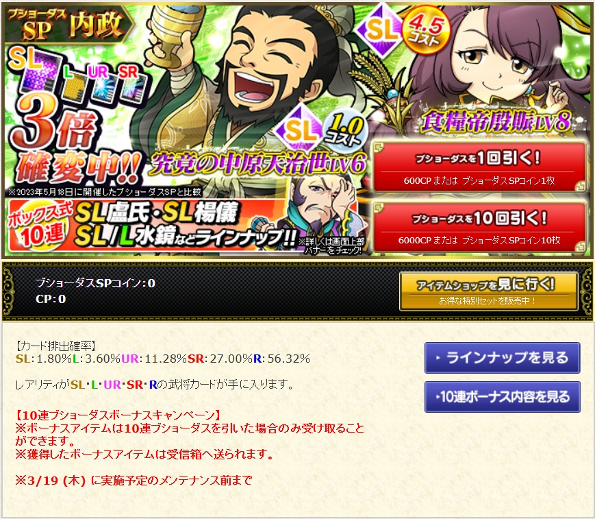 「究竟の中原天治世LV6」を所持した「No.1520 SL簡雍」が再登場しています。また、今回のブショーダスSP【内政】の各レアリティの排出確率は下記の通りです。