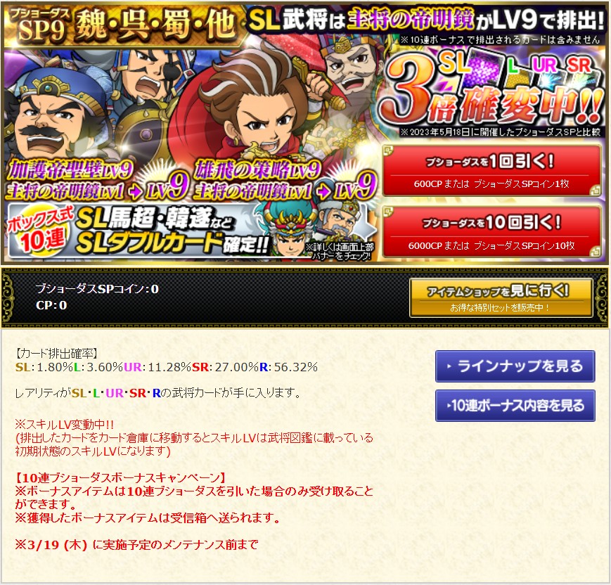※10連ボーナスカードのスキルLVは初期所持スキルLVのまま排出されます。また、レアリティSLの武将カードは1枠目の初期所持スキルがLV9となっております!