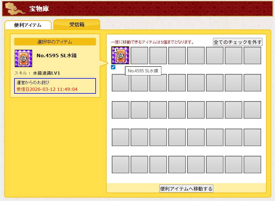 ※「宝物庫:受信箱」へ配布いたしております。この度は不具合発生に伴い、