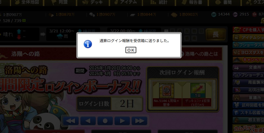 洛陽の路実装から1日も休まずログインしてれば今日で1998日目。