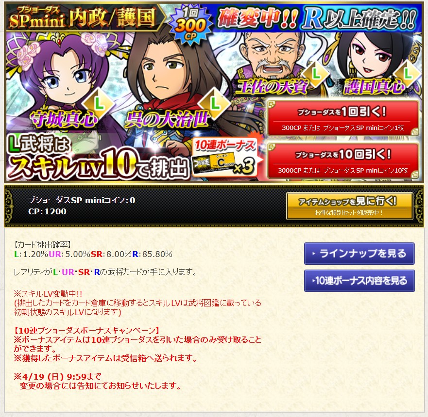 ブショーダスSPmini【内政/護国】が開催中です。今回のブショーダスSPmini【内政/護国】の通常ラインナップでは、