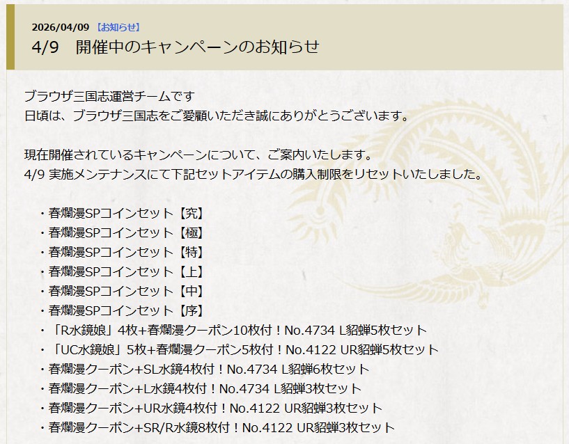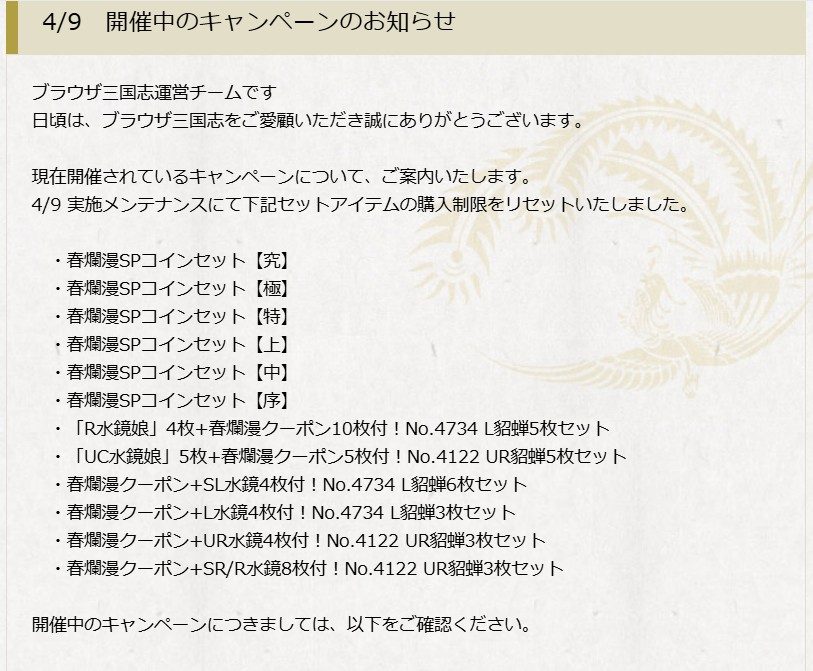 ※上記3つのアイテムは購入制限リセット対象外です。<開催期間:4/5 10:00:00 – 4/19 09:59:59>