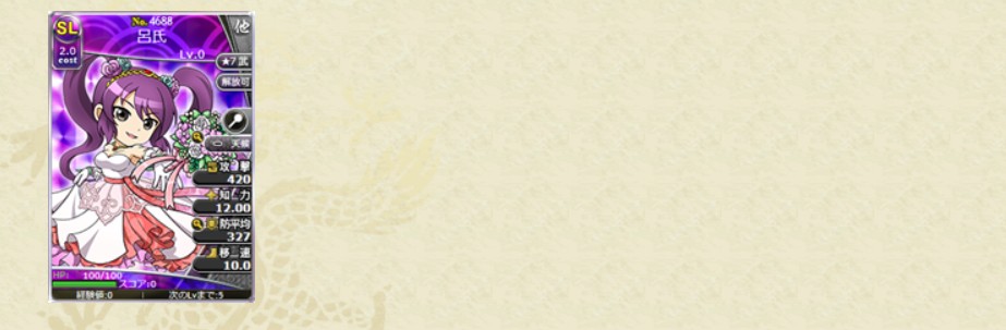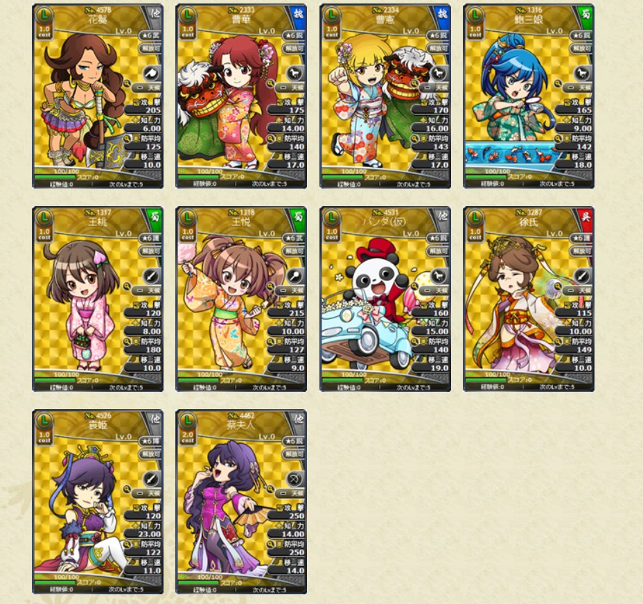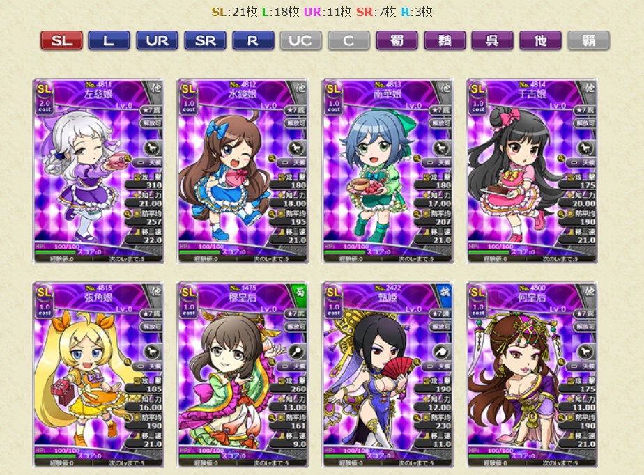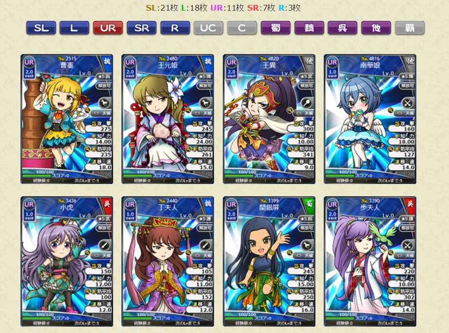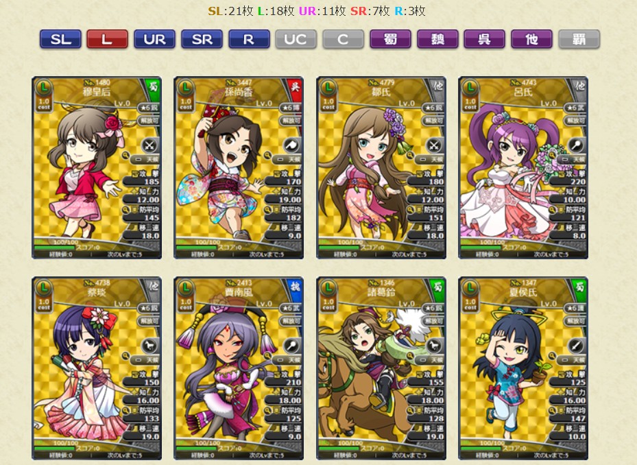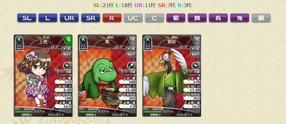 コスト1.0のレアリティSL、Lの武将カードのみの