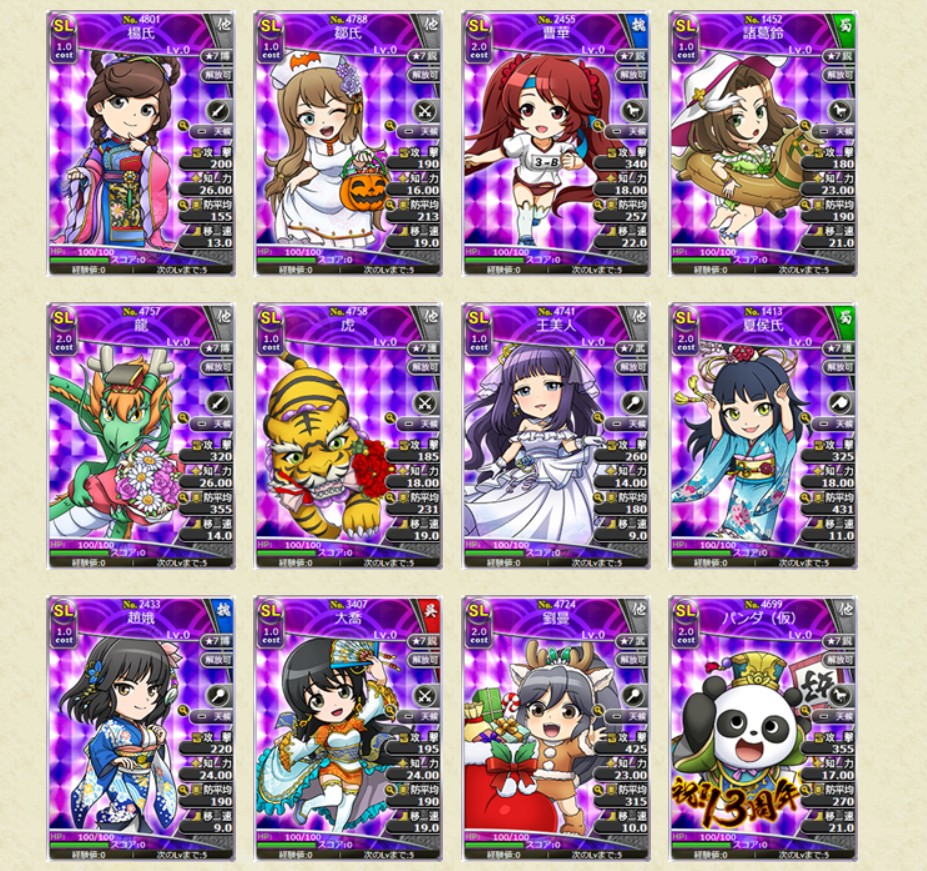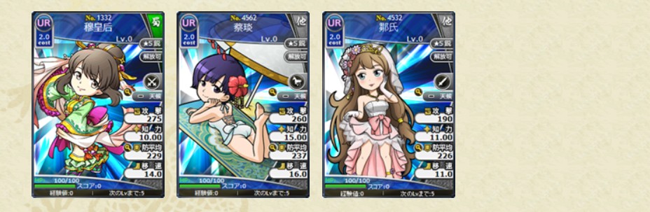 ・No.4812 SL水鏡娘 副将の帝明鏡LV10 1枚 ・No.4813 SL南華娘 副将の帝明鏡LV10 1枚 ・No.4814 SL于吉娘 副将の帝明鏡LV10 1枚 ・No.4815 SL張角娘 副将の帝明鏡LV10 1枚 ・No.4800 SL何皇后 副将の帝明鏡LV10 1枚 ・No.4788 SL鄒氏 副将の帝明鏡LV10 1枚 ・No.1452 SL諸葛鈴 副将の帝明鏡LV10 1枚 ・No.3407 SL大喬 副将の帝明鏡LV10 1枚 ・No.1480 L穆皇后 副将の天明鏡LV10 1枚 ・No.4779 L鄒氏 副将の天明鏡LV10 1枚 ・No.4738 L蔡琰 副将の天明鏡LV10 1枚 ・No.1346 L諸葛鈴 副将の天明鏡LV10 1枚 ・No.2333 L曹華 副将の天明鏡LV10 1枚 ・No.2334 L曹憲 副将の天明鏡LV10 1枚 ・No.1316 L鮑三娘 副将の天明鏡LV10 1枚 ・No.4531 Lパンダ(仮) 副将の天明鏡LV10 1枚 ブラウザ三国志より引用