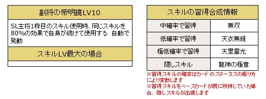 <開催期間:4/23 メンテナンス終了後 – 4/30 実施予定のメンテナンス開始前>スキル「副将の帝明鏡」や「副将の天明鏡」などのスキルを所持した武将たちが