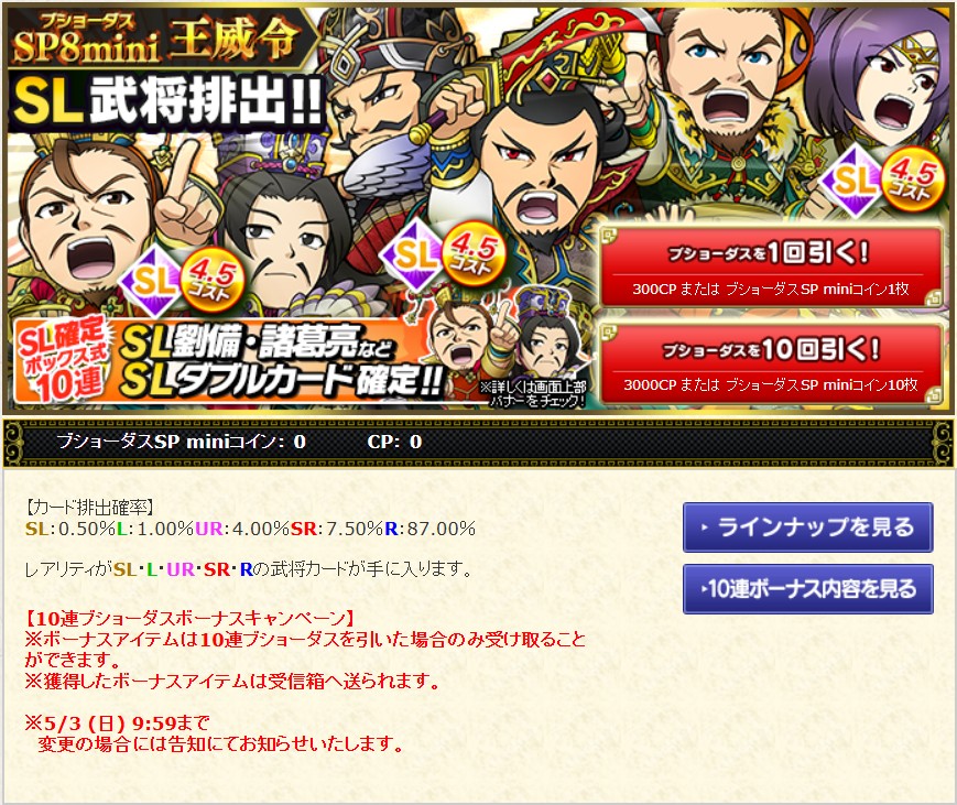 ブショーダスSP8mini【王威令】が開催中です。レアリティSLでは