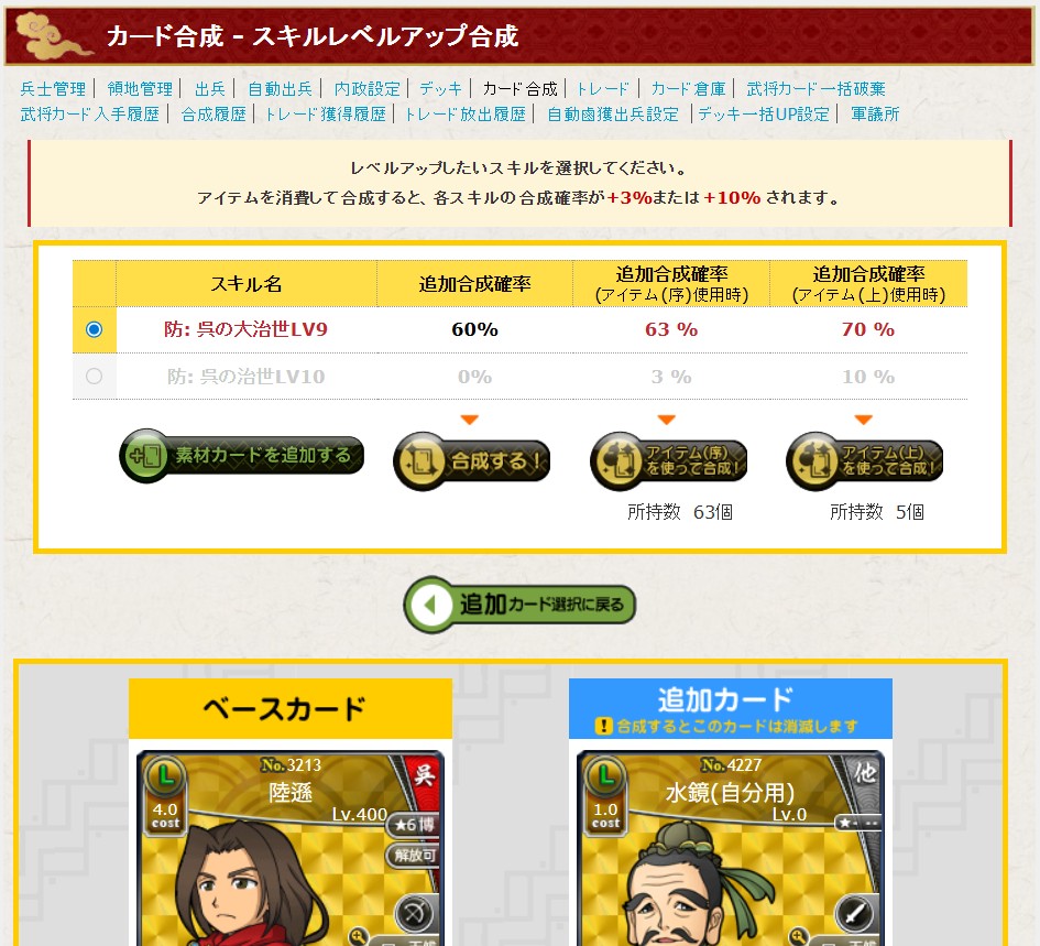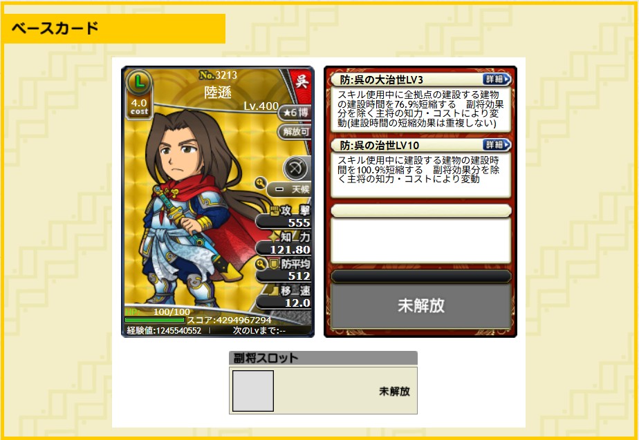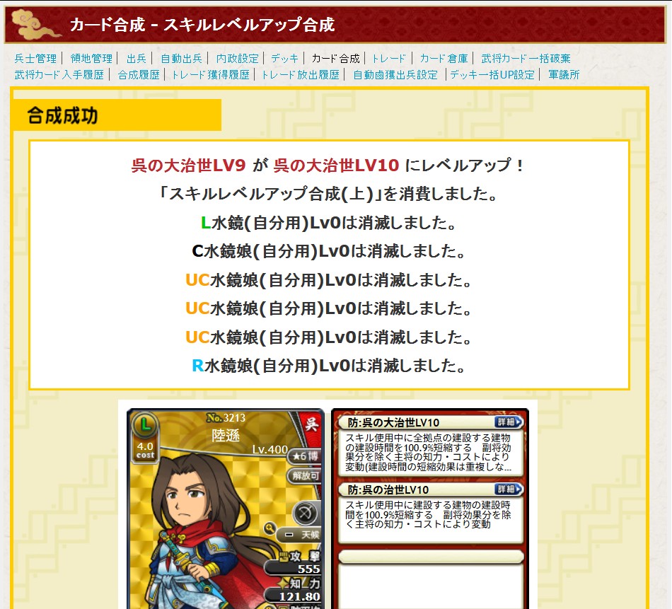 記事のネタが尽きたので、初期スキルである呉の大治世もレベル10にして、ダブル即完カードに仕上げるだわさ。